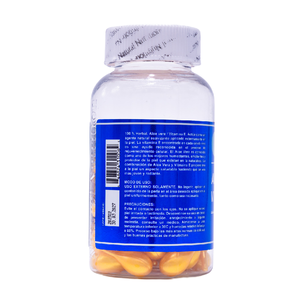 El Aloe Vera + Vitamina E Natural Nutrition es un tratamiento cosmético de uso tópico en perlas, diseñado para hidratar, suavizar y mejorar la apariencia general de la piel. Esta fórmula combina dos ingredientes ampliamente reconocidos en el cuidado facial: el Aloe Vera, valorado por su acción humectante y refrescante, y la Vitamina E, conocida por su aporte antioxidante y su capacidad para favorecer una apariencia saludable y luminosa.
